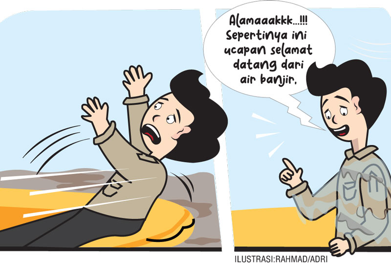 ”Alamaaakkk…!!! Sepertinya ini ucapan terima kasih dan selamat datang dari air banjir, sehingga saya disuruh main air lagi,” celetuk Pak Key saat sudah dibantu naik kembali ke atas perahu karet.