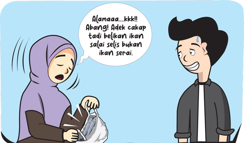 ”Alamaaa….kkk!! Abang! Adek cakap tadi belikan ikan salai selis bukan ikan serai. Adek tu nak buat gulai ikan salai selis, bukan ikan serai,” kata sang istri.