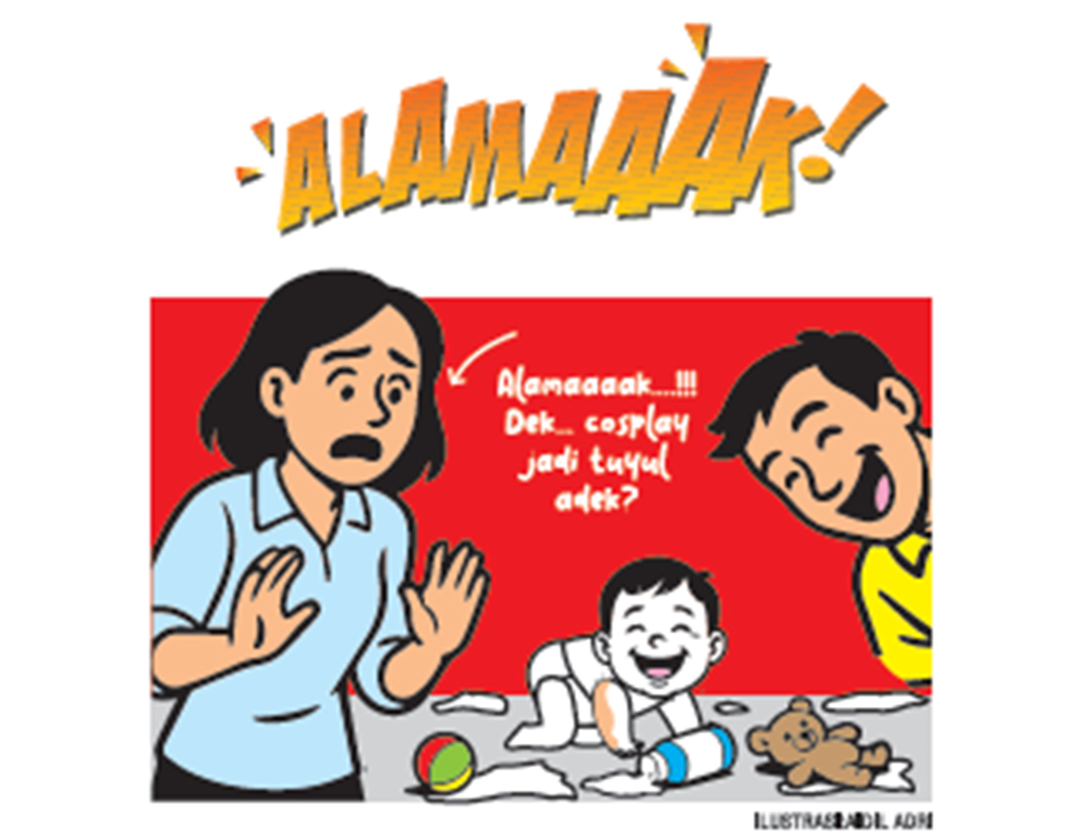 ”Alamaaaak….!!! Dek.. cosplay jadi tuyul adek? Habis lah bedak di buang semuanya,” ujar Wiwis yang langsung memindahkan anak jauh dari bedak tabur yang berserakan di lantai.