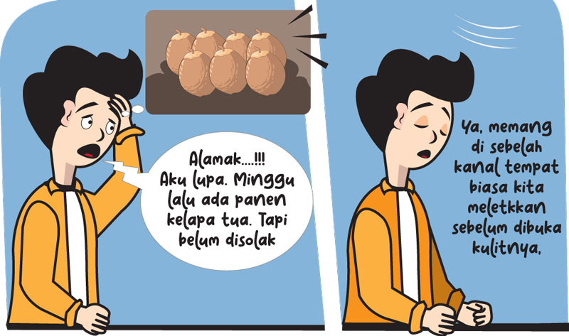 ”Alamak….!!! Aku lupa. Minggu lalu ada panen kelapa tua. Tapi belum disolak (buka, dalam bahasa Tembilahan),” tuturnya.