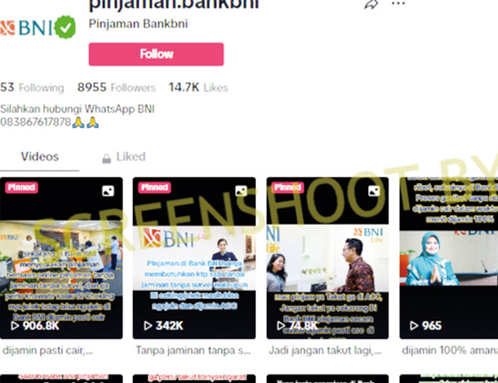 [PENJELASAN]: Ditemukan sebuah akun Tiktok yang bernama @pinjaman_bankbni yang berisi banyak konten mengenai pengajuan pinjaman online hanya dengan menghubungi nomor Whatsapp yang berada pada bio profil akun Tiktok tersebut.