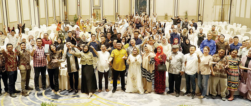 Manajemen Awal Bros, para undangan berfoto saat acara Gathering dan Buka Puasa Bersama Rekanan RS Awal Bros Group, di Novotel Pekanbaru. Selasa (2/4/2024). (DEFIZAL / Riau Pos)