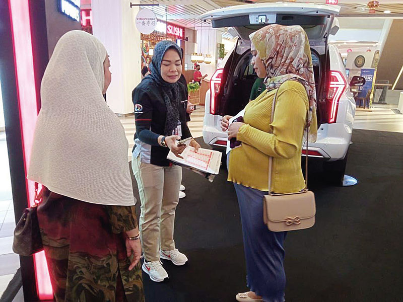 Tim marketing menyebarkan brosur kepada pengunjung Mal Living World yang datang ke Mitsubishi Motors Supermarket Exhibition yang berlangsung pada Senin-Ahad (5-11/2/2024). (SITI AZURA/RIAU POS )