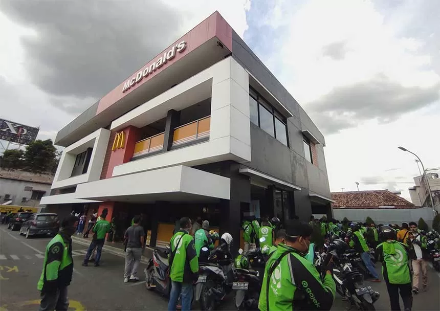 Antrean para mitra ojek online yang menimbulkan kerumunan di McDonalds Jalan Jenderal Sudirman Pekanbaru sehingga Tim Satgas Covid-19 melakukan penyegelan tempat tersebut (DOKUMEN RIAUPOS.CO)