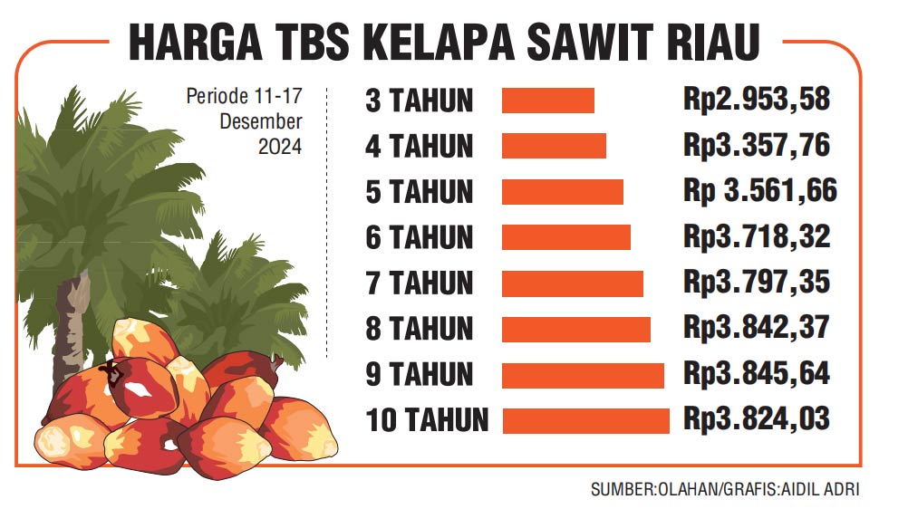 Kepala Dinas Perkebunan Riau Syahrial Abdi melalui Kabid Pengolahan dan Pemasaran Dr Defris Hatmaja mengatakan, kenaikan harga tertinggi berada di kelompok umur 9 tahun sebesar Rp115,50/Kg atau mencapai 3,10 persen dari harga pekan lalu. Sehingga harga pembelian TBS petani untuk periode satu pekan ke depan naik menjadi Rp3.845,64/Kg dan berlaku untuk periode satu pekan ke depan.