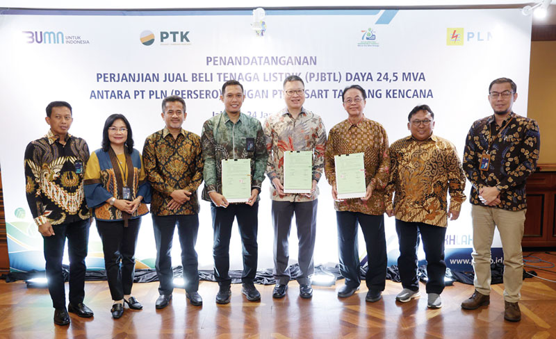 Jajaran manajemen foto bersama setelah penandatanganan Perjanjian Jual Beli Tenaga Listrik antara PLN dengan PT PTK di Jakarta, Rabu (24/1/2024). (PLN UNTUK RIAU POS)