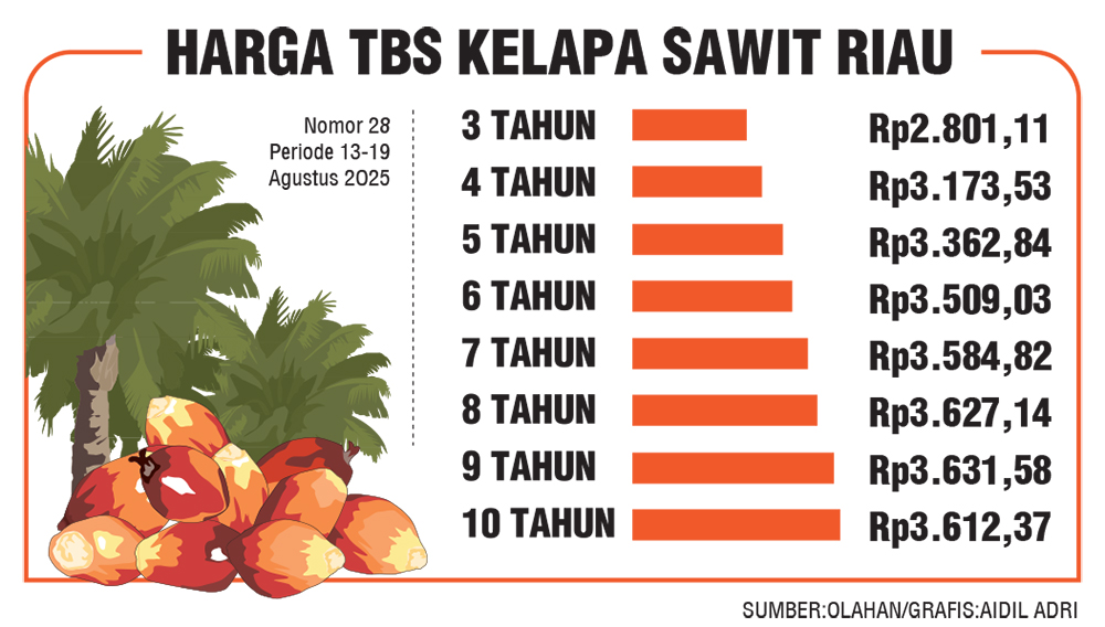 Kepala Dinas Perkebunan Riau Syahrial Abdi mengatakan, untuk kenaikan harga tertinggi berada dikelompok umur 9 tahun sebesar Rp22,79 per Kg atau mencapai 0,63 persen dari harga periode lalu. Sehingga harga pembelian TBS petani untuk periode satu pekan kedepan naik menjadi Rp3.631,58 per Kg dan berlaku untuk periode satu pekan kedepan.