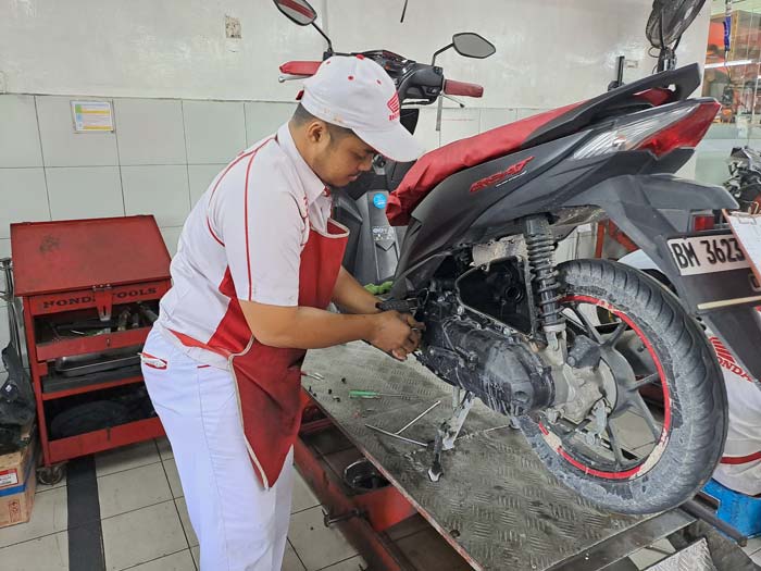 Mekanik Honda melakukan service sepeda motor Honda milik konsumen, baru-baru ini. (CDN UNTUK RIAUPOS.CO)