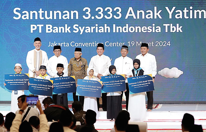 Wakil Presiden Ma’ruf Amien dan Dirut BSI Hery Gunardi (tiga kanan) memberikan santunan secara simbolik kepada 3.333 anak yatim di Jakarta, Selasa (19/3/2024). (FEDRIK TARIGAN/ JAWA POS)