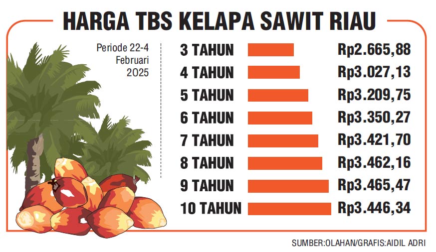 Kepala Dinas Perkebunan Riau Syahrial Abdi mengatakan, kenaikan harga tertinggi berada di kelompok umur 9 tahun sebesar Rp3,14/kg atau mencapai 0,09 persen dari harga periode lalu. Sehingga harga pembelian TBS petani untuk periode satu pekan ke depan naik menjadi Rp3.465,47/kg dan berlaku untuk periode dua pekan ke depan, dengan harga cangkang berlaku untuk satu bulan ke depan dengan harga sebesar Rp22,55/kg.(muh)