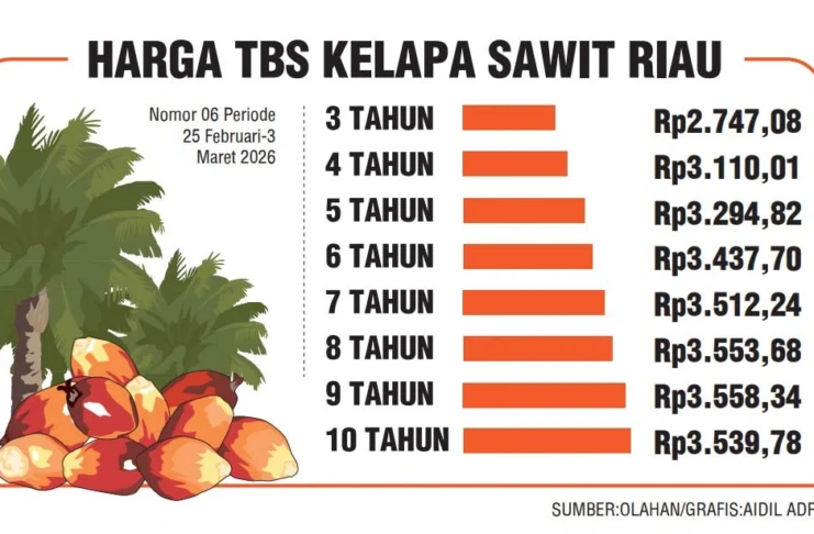 Kepala Dinas Perkebunan Riau, Supriadi, mengatakan harga pembelian TBS petani untuk periode satu pekan ke depan turun menjadi Rp3.558,34 per kilogram. Harga tersebut berlaku untuk sepekan ke depan, dengan harga cangkang sebesar Rp16,51 per kilogram.