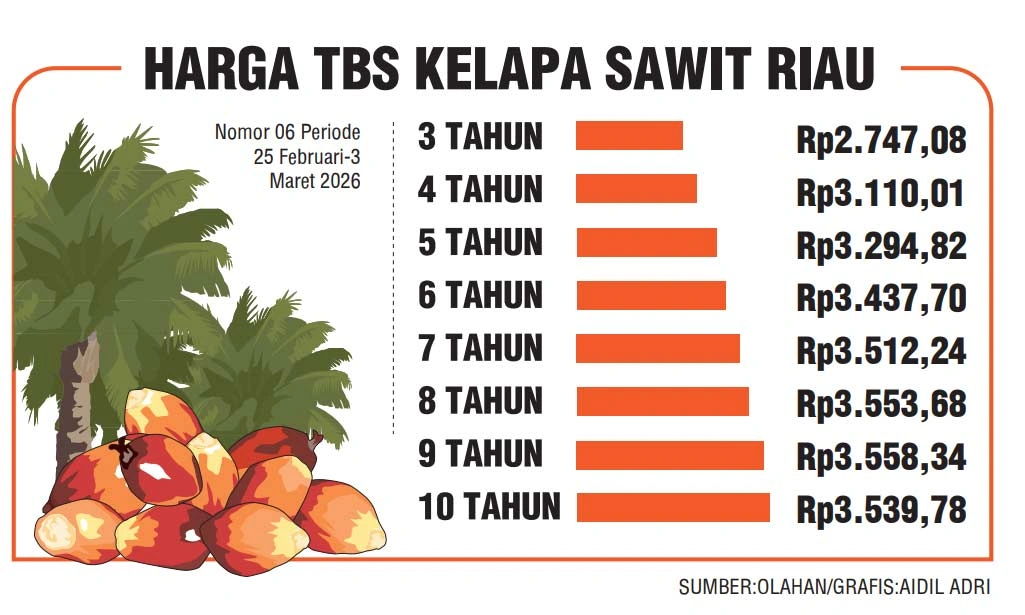 Kepala Dinas Perkebunan Riau, Supriadi, mengatakan harga pembelian TBS petani untuk periode satu pekan ke depan turun menjadi Rp3.558,34 per kilogram. Harga tersebut berlaku untuk sepekan ke depan, dengan harga cangkang sebesar Rp16,51 per kilogram.