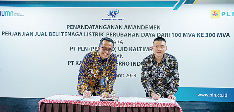 Komitmen ini dibuktikan salah satunya dengan Penandatanganan Amandemen Perjanjian Jual Beli Tenaga Listrik (PJBTL) Penambahan Daya Konsumen Tegangan Tinggi antara PLN dengan PT Kalimantan Ferro Industry (KFI) pada Selasa (5/3) di Jakarta. Melalui kerja sama ini, PLN bakal menambah daya pasokan dari 100 Mega Volt Ampere (MVA) ke 300 MVA untuk PT KFI.