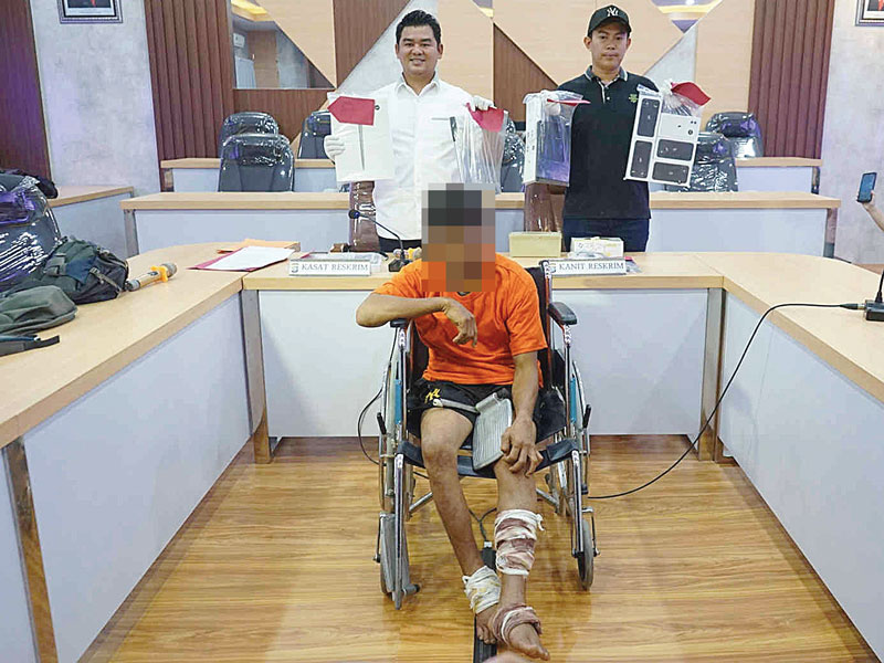 Seorang pria berinisial MS (39) duduk di kursi roda. Ada tiga perban melilit di kedua kakinya. Ia terlihat pasrah saat belasan wartawan mengambil foto wajahnya di ruang Kiambang, Mapolresta Pekanbaru, Rabu (27/3) siang itu.