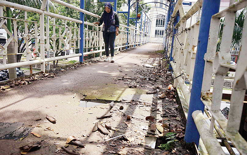 Pejalan kaki melintas di Jembatan Penyeberangan Orang (JPO) Jalan Sudirman depan Balai Sudirman Pekanbaru, Senin (26/2/2024). Sejumlah bagian jembatan tampak rusak seperti lantai, pagar, maupun atap jembatan. (EVAN GUNANZAR/RIAU POS)