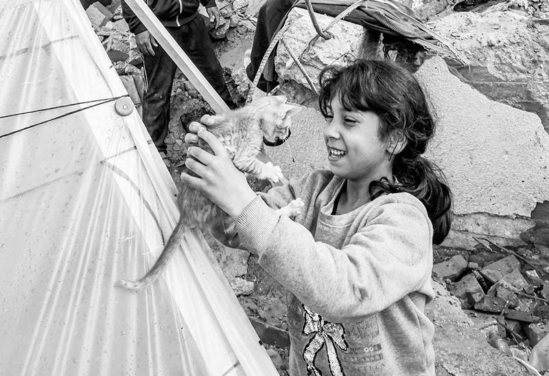 Seorang gadis bermain dengan anak kucing di tenda pengungsian saat yang lain memeriksa puing-puing bangunan runtuh akibat serangan Israel di Rafah, Jalur Gaza Selatan, Selasa (2/1/2024). (JACK GUEZ/AFP)
