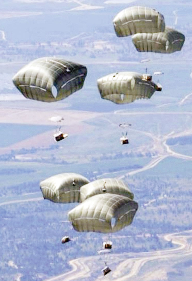 Bantuan kemanusiaan dijatuhkan dari pesawat militer di Jalur Gaza, di tengah pertempuran yang sedang berlangsung antara Israel dan kelompok militan Palestina Hamas, Selasa (5/3/2024). (tentara Yordania / AFP )