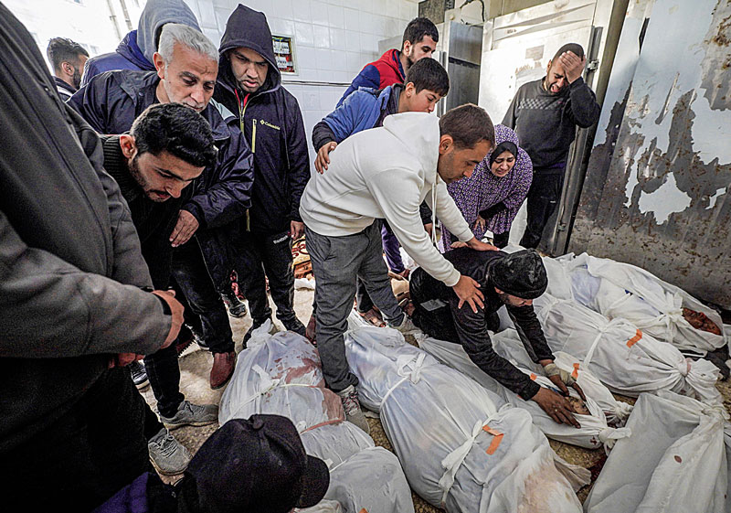 Warga Palestina saat melihat jenazah keluarganya yang tewas dan jadi korban pemboman Israel di rumah sakit al-Aqsa, Deir el-Balah, Jalur Gaza tengah, Rabu (6/3/2024). (AFP )