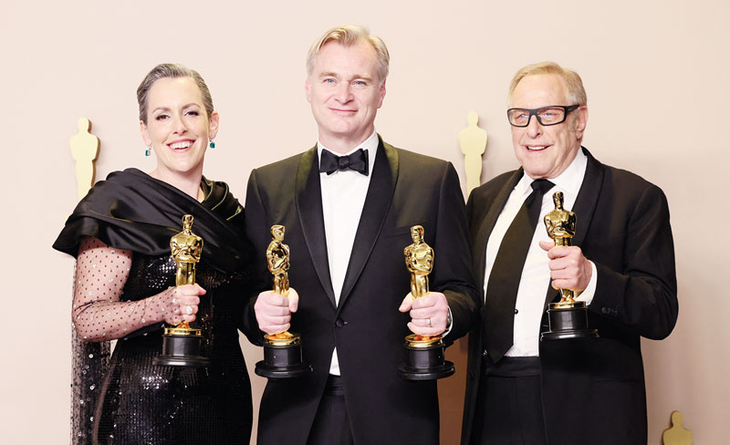 Dari kiri, Emma Thomas, Christopher Nolan, dan Charles Roven memegang Piala Oscar yang diraih dalam Academy Awards di Ovation Hollywood, California, Senin (11/3/2024). (Rodin Eckenroth/Getty Images/AFP )