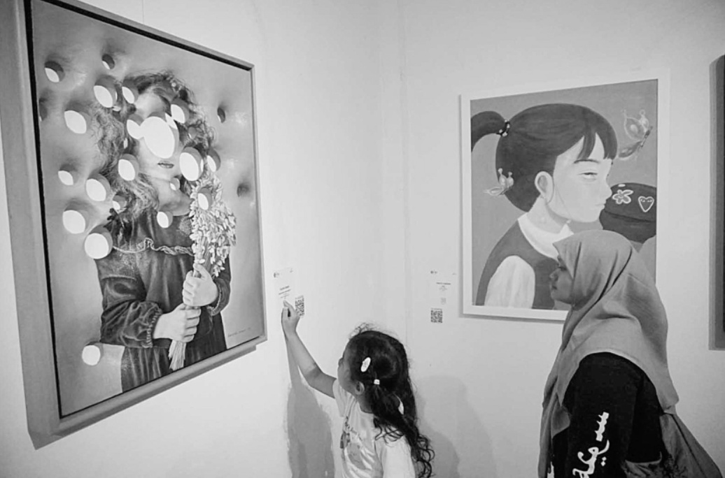 Dua pengunjung sedang melihat beberapa lukisan setelah acara pembukaan pameran seni rupa bertajuk Epik di Galeri Hang Nadim (GHN), Pekanbaru, Sabtu (31/8/2024) lalu. (Mhd akhwan/RIAU POS)