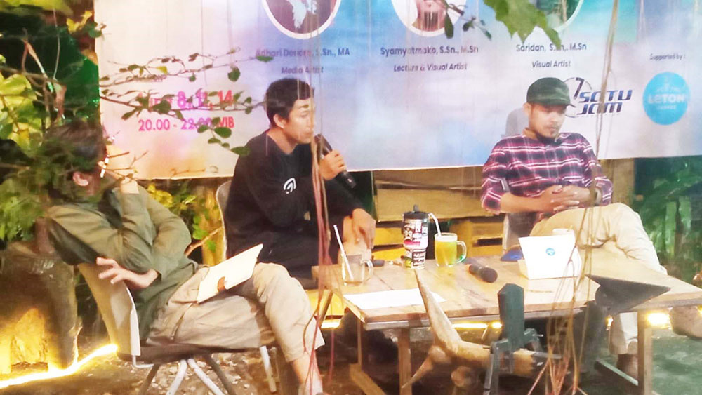 Malam itu, di sana sedang berlangsung acara sharing session dengan tema “Mau ke Mana Arah Kesenian di Riau: Kini dan Masa Depan”. Dua pembicara hadir dalam acara itu, yakni pegiat seni kontemporer Adhari Donora SSn MA dan Saridan SSn MSn. Satu pembicara lagi, Syamyatmoko SSn MSn, urung hadir karena mendadak mengalami gangguan kesehatan. Praktisi dan kurator seni Fachrozi Amri menjadi moderator yang mengantarkan jalannya diskusi. Rencananya diskusi tentang seni rupa ini akan berlanjut dalam dua sesi lagi.