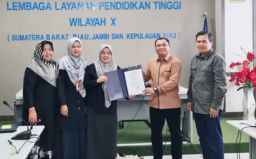 Rektor Universitas Lancang Kuning (Unilak), Prof Dr Junaidi (dua kanan), saat menerima SK Pendirian Prodi Bahasa Melayu Riau dari Kepala LLDIKTI WIlayah X Afdalisma SH MPd di Padang, Rabu (16/10/2022) lalu. (Unilak untuk Riau Pos)