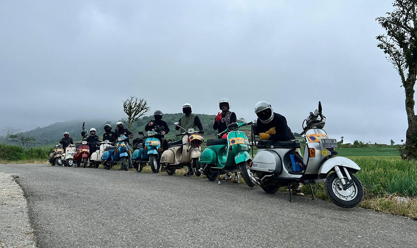 TOURING: Anggota Komunitas Kumbang Jantan Vespa Club saat touring di Sumbar, belum lama ini.