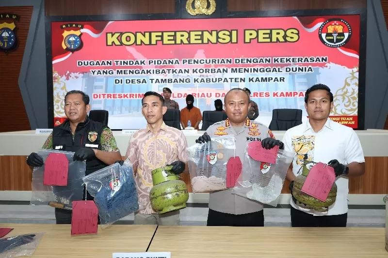 KAMPAR (RIAUPOS.CO) – Misteri perampokan yang merenggut nyawa Lisma Donna Roasta (43), warga Dusun Kampung Lintang, Desa Tambang, Kecamatan Tambang, akhirnya terungkap setelah empat bulan penyelidikan intensif oleh pihak kepolisian. Polda Riau resmi merilis hasil penangkapan pelaku dalam konferensi pers di Media Center, Jumat (4/7/2025).