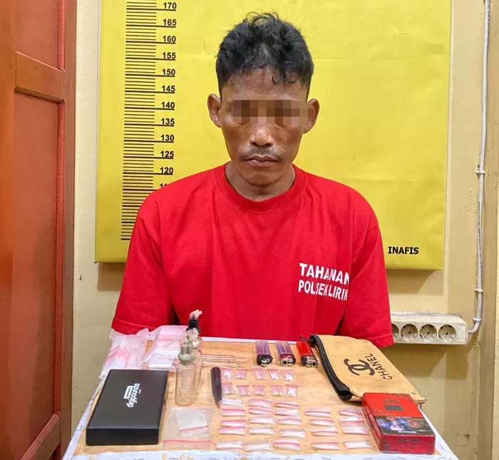 Saat dilakukan penggeledahan, polisi menemukan 33 bungkus plastik klip berisi sabu, satu unit timbangan digital, satu pack plastik klip kosong, tiga set alat hisap sabu (bong), serta perlengkapan lainnya.