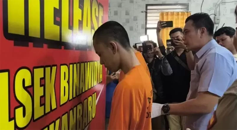 Kedua pelaku yakni APP (20) dan RA (19) saat diamankan di Polsek Binawidya, Selasa (6/5/2025). ((Humas Polsek Binawidya Pekanbaru))