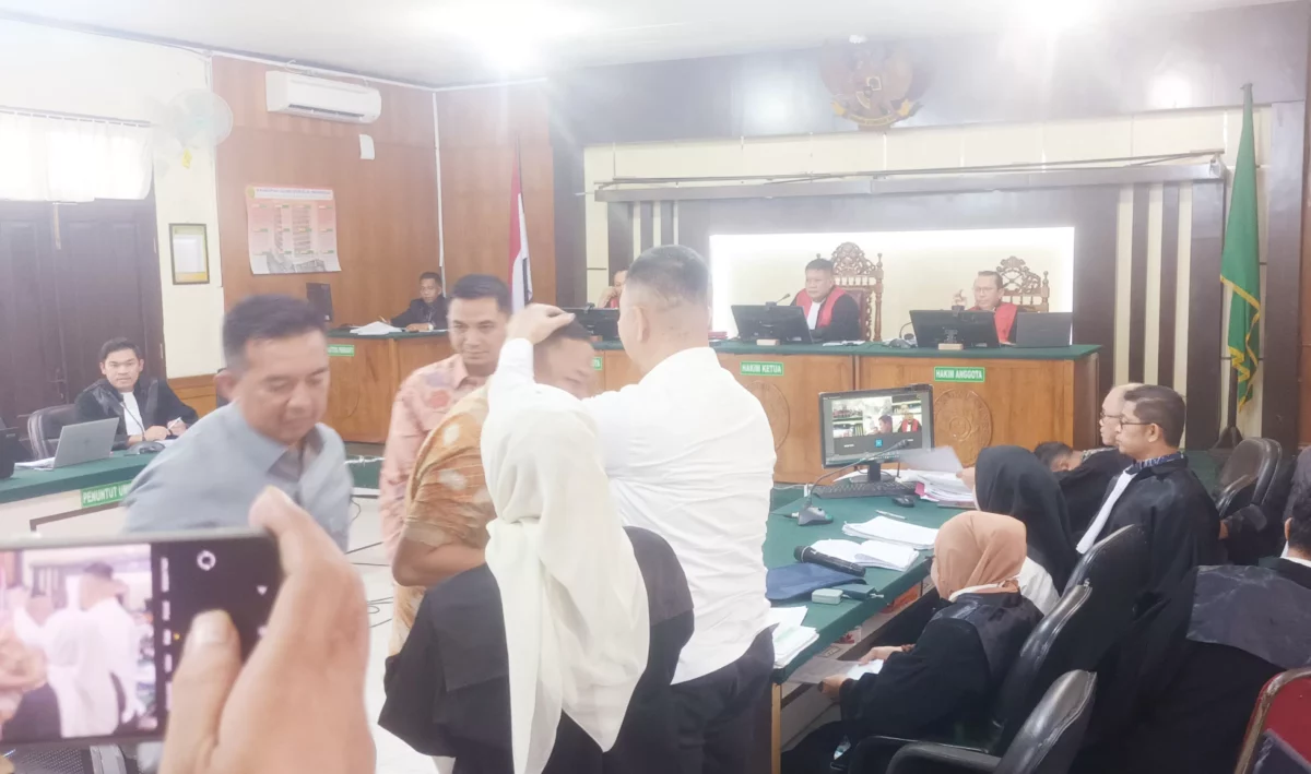 Terdakwa korupsi Indra Pomi Nasution (baju putih) memeluk Kabid di Dinas Perkim, Martin Manalouk, pada sidang di Pengadilan Negeri Pekanbaru