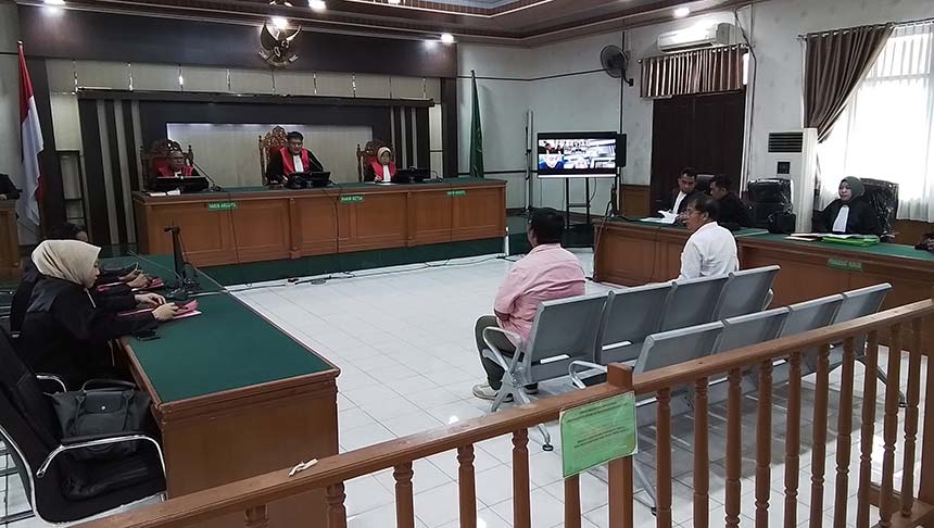 Mantan Ketua PMI Riau Syahril Abu Bakar (baju putih) dan mantan Bendahara PMI Riau Rambun Pamenan menjalani sidang dakwaan perkara korupsi di PN Pekanbaru, Selasa (18/3/2025). Hendrawan Kariman/Riau Pos