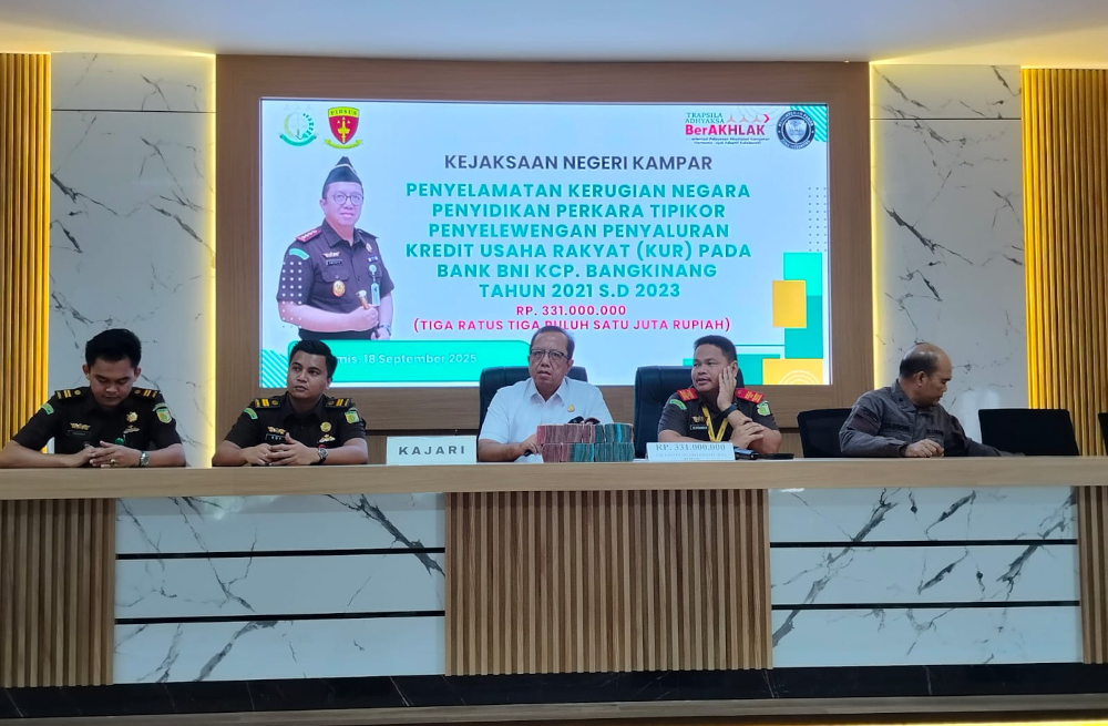BANGKINANG (RIAUPOS.CO) — Kejaksaan Negeri (Kejari) Kampar menyita uang sebesar Rp331 juta dari kasus dugaan korupsi penyaluran Kredit Usaha Rakyat (KUR) di BNI Kantor Cabang Pembantu (KCP) Bangkinang. Uang tersebut diamankan sebagai upaya memulihkan kerugian negara.