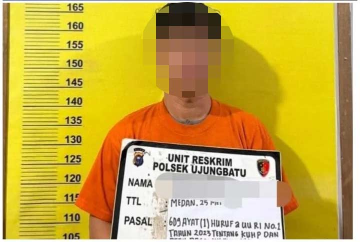 Dalam foto yang beredar, MTRS terlihat memegang papan identitas penahanan bertuliskan Unit Reskrim Polsek Ujungbatu, lengkap dengan pasal sangkaan yang dikenakan. Pada papan tersebut tercantum dugaan pelanggaran Pasal 609 ayat (1) huruf a Undang-Undang RI Nomor 1 Tahun 2023 tentang KUHP dan/atau Pasal 114 ayat (1) Undang-Undang RI Nomor 35 Tahun 2009 tentang Narkotika.