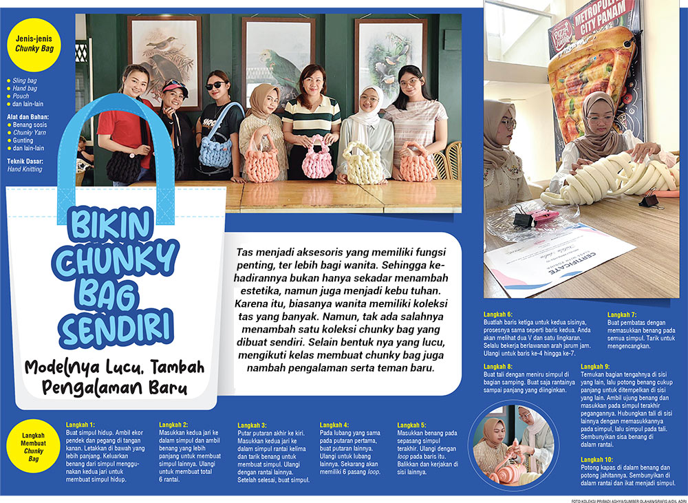 Tas menjadi aksesoris yang memiliki fungsi penting, terlebih bagi wanita. Sehingga kehadirannya bukan hanya sekadar menambah estetika, namun juga menjadi kebutuhan. Karena itu, biasanya wanita memiliki koleksi tas yang banyak. Namun, tak ada salahnya menambah satu koleksi chunky bag yang dibuat sendiri. Selain bentuknya yang lucu, mengikuti kelas membuat chunky bag juga nambah pengalaman serta teman baru.