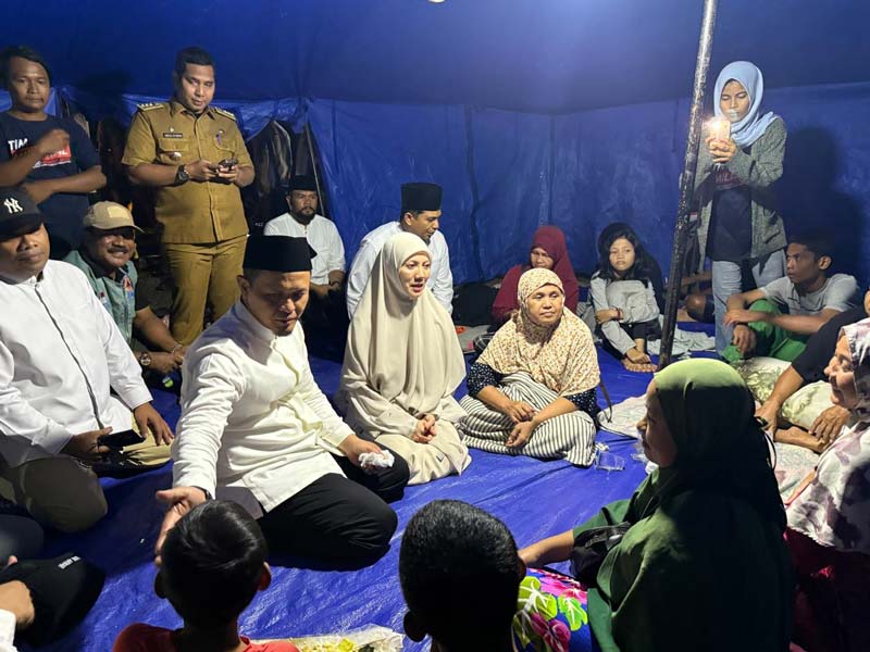 Wako Pekanbaru Agung Nugroho bersama Ketua TP PKK Pekanbaru Sulastri berdialog dengan korban banjir yang mengungsi ke tenda pengungsian di Kecamatan Rumbai, Selasa (4/3/2025).