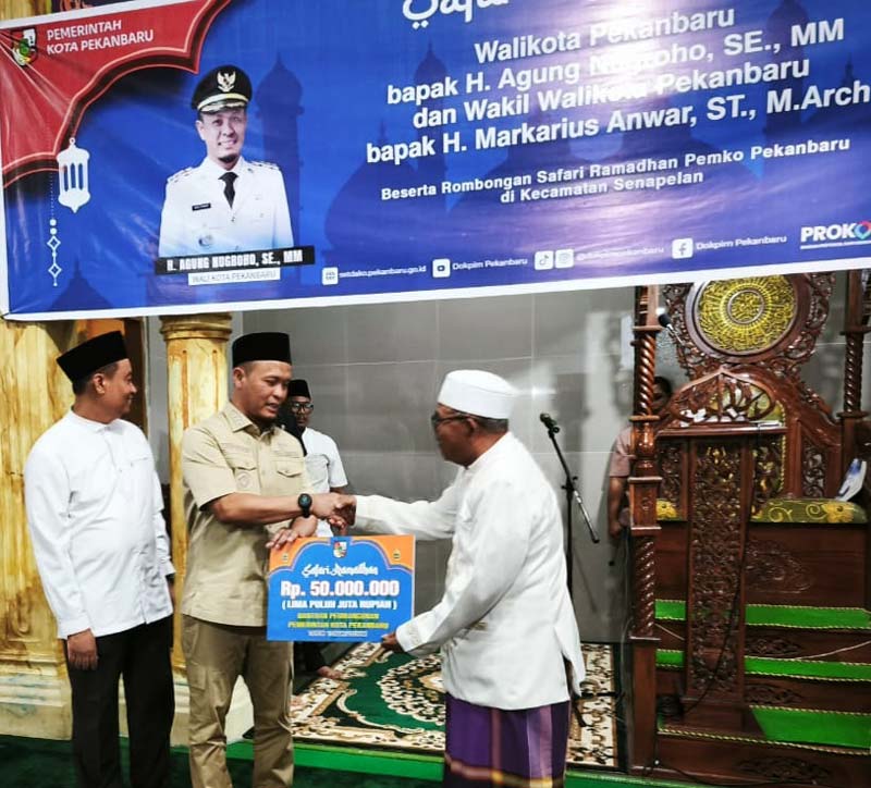 Wako Pekanbaru H Agung Nugroho dan Wawako Pekanbaru H Markarius Anwar memberikan bantuan pada pengurus Masjid Al-Huda yang diwakili Ketua Masjid Jumain dalam Safari Ramadan, Selasa (11/3/2025).