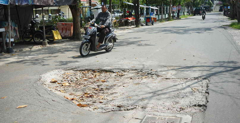 AMBLAS: Pengendara melintas di Jalan Balam, Kecamatan Sukajadi yang kembali amblas di dekat proyek galian Sistem Pengolahan Air Limbah Domestik Terpadu (SPALD-T), Senin (26/2/2024). (EVAN GUNANZAR/RIAU POS)