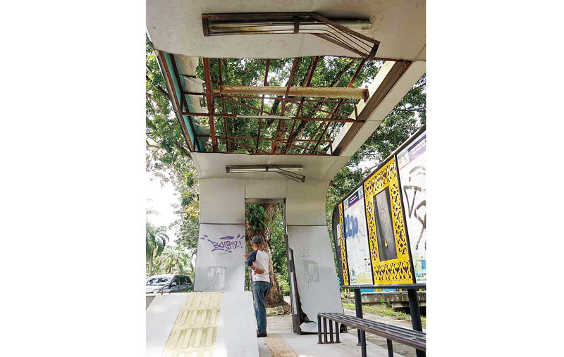 Bahkan sesekali pengguna halte Bus TMP yang nunggu kedatangan bus Transmetro Pekanbaru melihat bagian atas dan mencari titik teraman agar tidak kejatuhan bahan bangunan yang terlihat ingin runtuh itu.