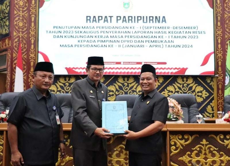 Wakil Ketua DPRD Dumai Mawardi menyerahkan laporan hasil kunjungan kerja fraksi DPRD Dumai kepada Sekretaris Kota Dumai Indra Gunawan, Rabu (3/1/2024). (Diskominfotiks Dumai untuk riau pos)