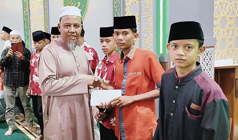 Kegiatan menyantuni anak yatim termasuk salah satu agenda rutin dalam Kenduri Kampung di Masjid Assalam, Sabtu (2/3/2024). (SYAHRI RAMLAN/RIAUPOS.CO)