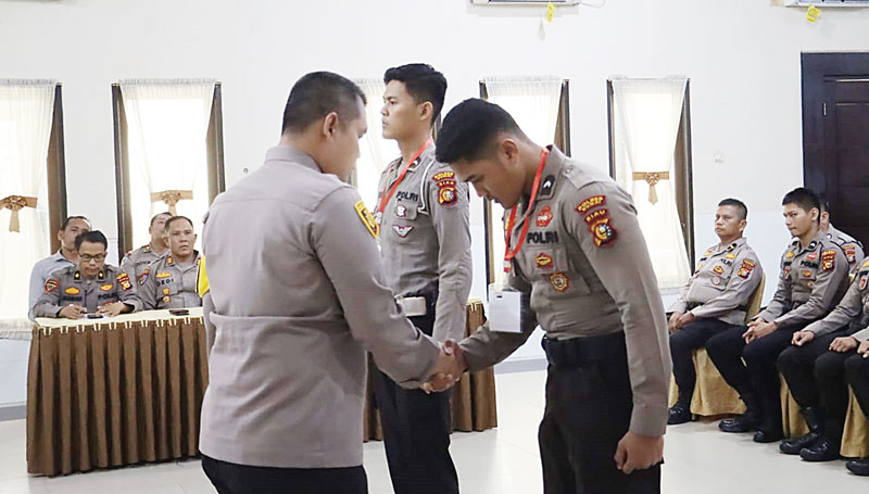 Kapolres Dumai AKBP Dhovan Oktavianton SH SIK MSi mengalungkan tanda peserta kepada anggota yang mengikuti pelatihan praoperasi ketupat Idulfitri di Mapolres Dumai, Kamis (4/4/2024). (SYAHRI RAMLAN/dumai)