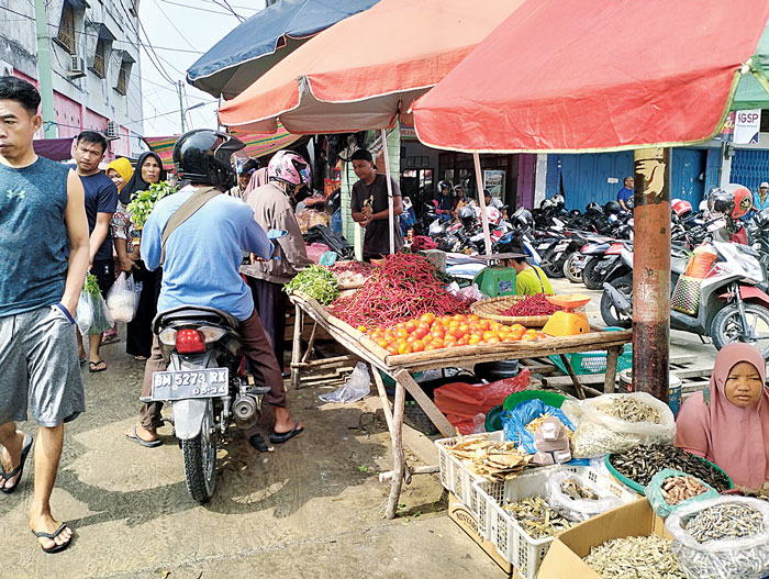 Salah seorang pedagang yang menggelar barang dagangan di Pasar Pulau Payung sedang menunggu datangnya calon pembeli, Senin (6/5/2024). (SYAHRI RAMLAN/dumai)