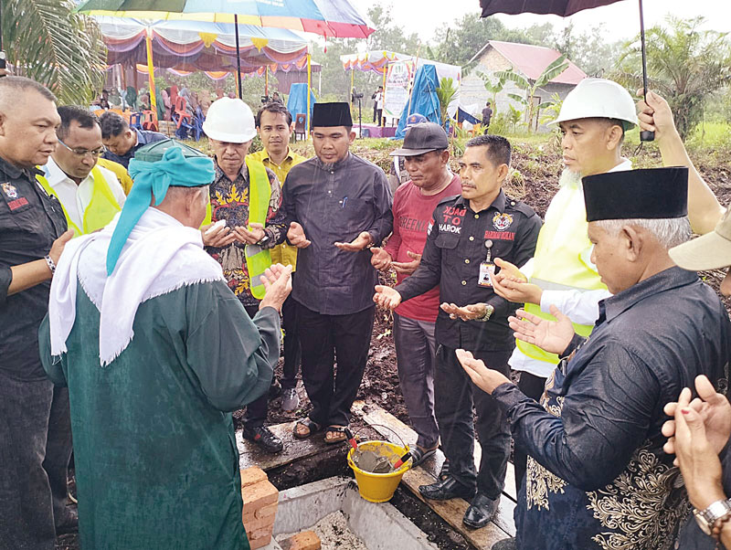 Wali Kota Dumai H Paisal SKM Mars dan Bupati Rohil Afrizal Sintong bersama unsur lainnya melakukan doa bersama saat peletakan batu pertama pembangunan Gedung Sekretariat Ikrohil Dumai di Jalan Tanjung Sari, Kelurahan Tanjung Palas, Kecamatan Dumai Timur, Kamis (8/2/2024). (SYAHRI RAMLAN/RIAUPOS.CO)