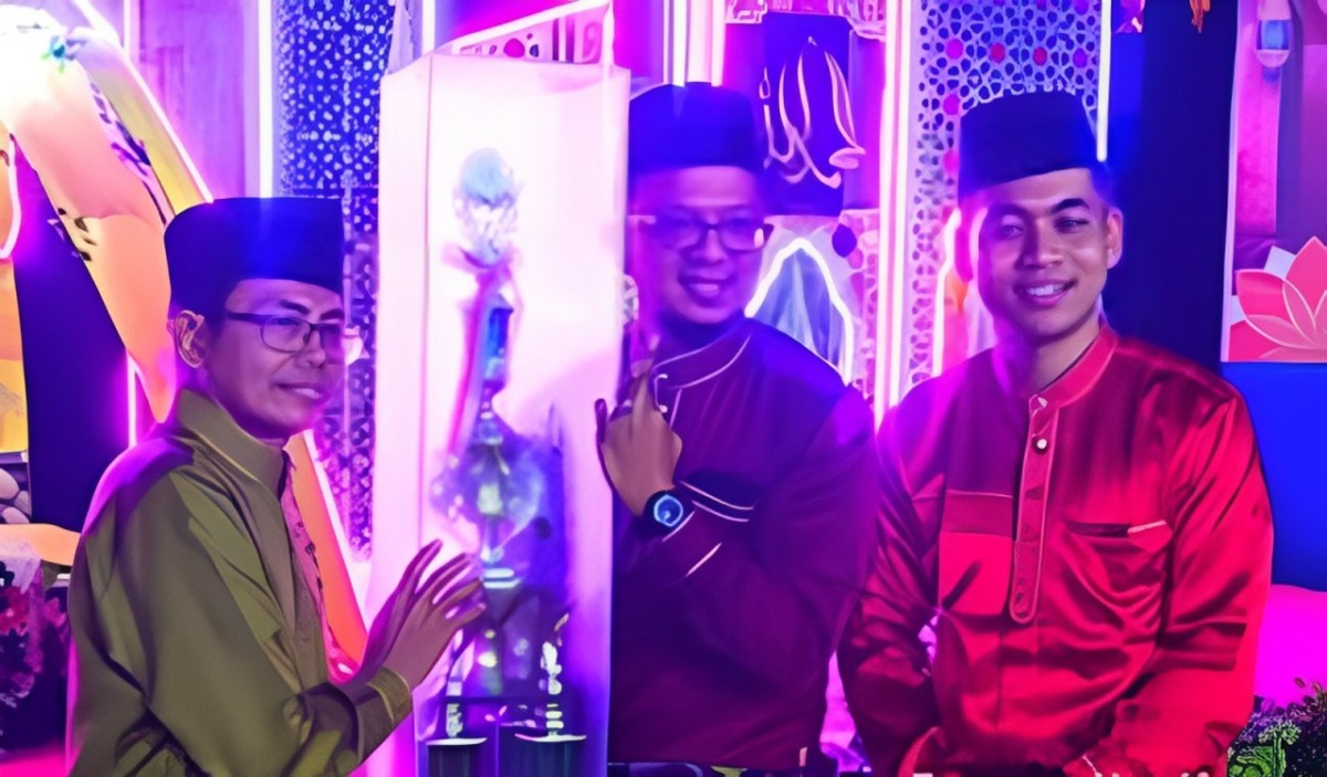 Kasi Kesosbud Kecamatan Pinggir Fahmi Ulul Albab (tengah) menyerahkan piala kepada kafilah RW 01 sebagai juara umum MTQ ke-5 tingkat Kelurahan Titian Antui di halaman Kantor Kelurahan Titian Antui, Rabu (10/7/2024) malam. (RPG)