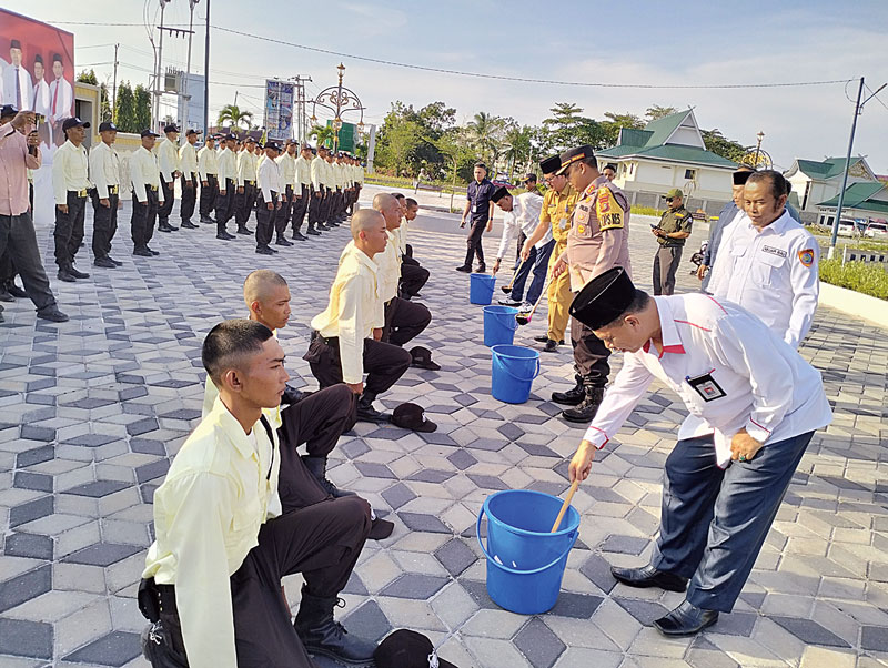 Kapolres Dumai Dhovan Oktavianton dan Sekdako Dumai H Indra Gunawan serta unsur Baznas Dumai, mengguyur air kembang ke atas kepala sekuriti dengan air kembang sebelum mengikuti Diksar di Dumai, Selasa (20/2/2024). (SYAHRI RAMLAN/RIAU POS)