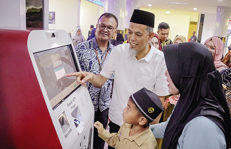 Wali Kota Dumai H Paisal memperlihatkan cara kerja mesin ADM dalam hal khidmat kependudukan, serta juga untuk meminimalisir kesalahan dalam hal kependudukan. (RPG/RIAUPOS.CO)