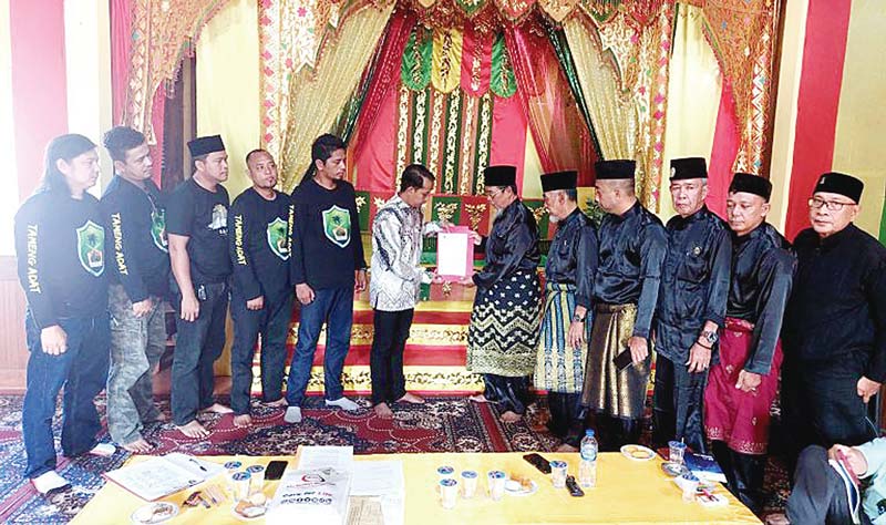 Rombongam Tameng Adat diterima oleh Ketua DPH LAMR Mandau Datuk H Revolaisya dan beberapa pengurus, yang berlangsung di Gedung LAMR Mandau, Jalan Hang Tuah, Simpang Pokok Jengkol, Duri beberapa hari lalu.