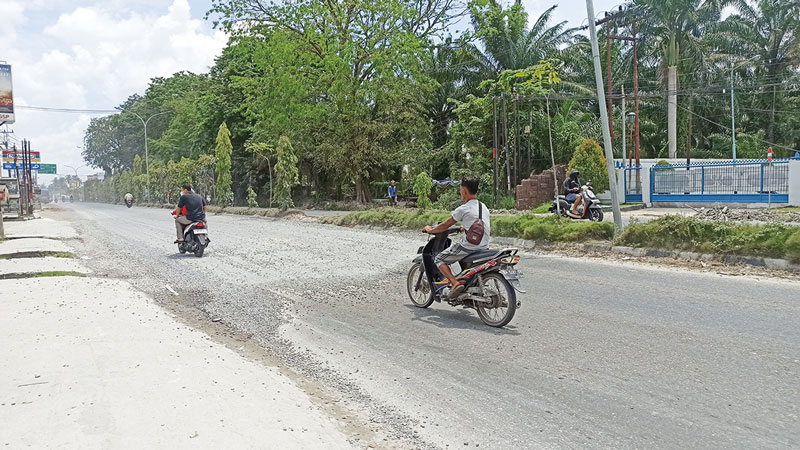 ”Iya sedang proses perbaikan tapi belum diaspal. Masih dipadatkan dengan pasir dan kerikil dengan panjang kira-kira hanya puluhan meter saja. Tidak semua jalan disini di overlay, hanya sebagian saja,” ujar Adi.