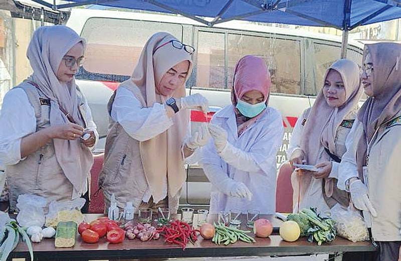 Tim Dinas Ketahanan Pangan Pekanbaru melakukan pengujian terhadap bahan pangan yang dijual di pasar tradisional di Kota Pekanbaru, Rabu (31/7/2024). (Disketapang pekanbaru untuk Riau Pos)